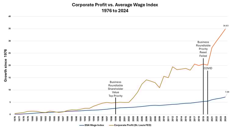 In 1999, at the Business Round Table, a membership-funded, nonprofit trade association and lobbying group composed of more than 200 CEOs decided that shareholder value was the only priority for a corporation. Focusing on social welfare or employee care was not a priority. This decision was codified in a charter-like document at the time. Many people likely didn't realize it was a deliberate choice by business leaders; I didn't. It seemed like a continuation of the growing power of business, financial institutions, and billionaires. During this period, the influence of shareholder value peaked. Over time, this sole focus has waned, but the allure remains as leaders become more transactional and less connected to employees than at any point in our history.