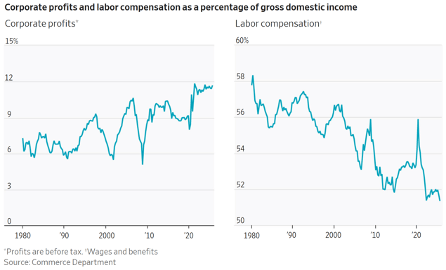 The plot below is from The Wall Street Journal on corporate profits vs. labor compensation. From the article, "Winners and Losers: Since the end of 2019, just before the pandemic, workers have basically just kept up. After inflation, average hourly wages are up 3%. For workers in aggregate, total compensation is up 8%. Meanwhile, profits have climbed 43%. "