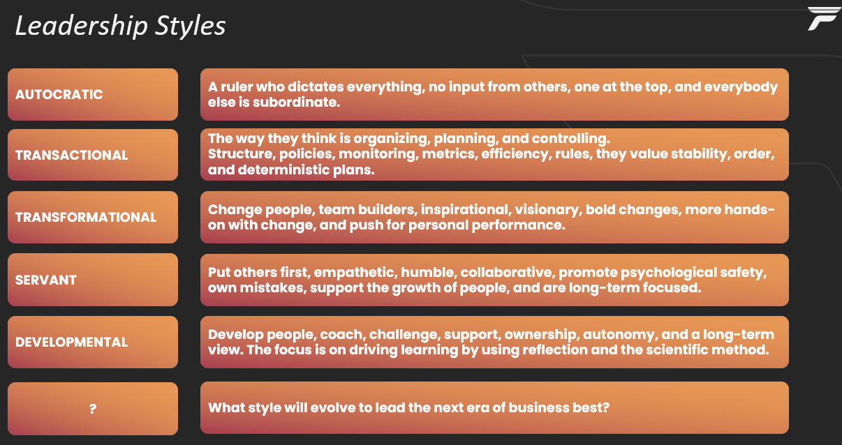 Leadership styles drive leaders' behavior. It is good for us to reflect on our style and evaluate whether it aligns with the market and the system of work we are in. It is also important to reflect on our leadership history and get a better sense of what our future will look like. This will help us dial in our style for what is coming, and we might need skills in some areas we don't have today to be more effective.